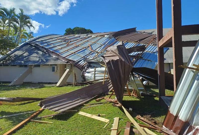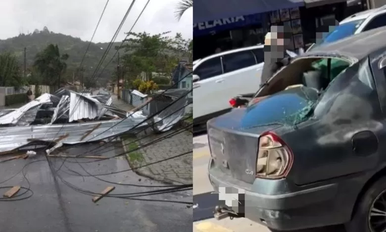 Em Tubarão, no Sul do estado, uma placa caiu sobre uma moto e um carro, e uma árvore foi arrancada pela raiz pela força do vento.