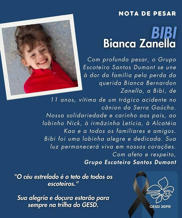 Em nota de pesar, o Grupo Escoteiro Santos Dumont (GESD), de Curitiba, lamentou profundamente a perda. “Bianca Bernardon Zanella, de 11 anos, deixou sua luz em cada passo na trilha da Alcateia Kaa”, escreveu a entidade, que ainda descreveu a menina como uma “lobinha alegre e dedicada”. O grupo encerrou a homenagem afirmando que “sua luz permanecerá viva em nossos corações”.