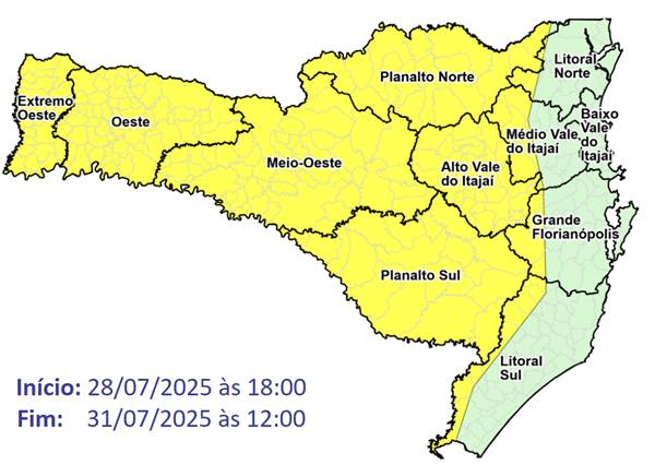 O declínio de temperatura será mais intenso entre a noite de segunda (28) e o amanhecer de terça-feira (29), onde a temperatura deve apresentar queda de aproximadamente 10°C, principalmente entre o Grande Oeste e os Planaltos, destacados nas áreas em amarelo do mapa.