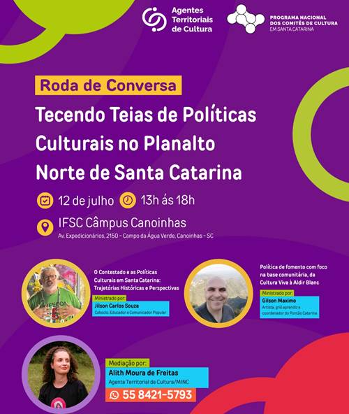 No próximo sábado (12), o Instituto Federal de Santa Catarina – Câmpus Canoinhas sedia a roda de conversa “Tecendo Teias de Políticas Culturais no Planalto Norte de Santa Catarina”, promovida pelo projeto Agentes Territoriais de Cultura, do Ministério da Cultura (MinC).