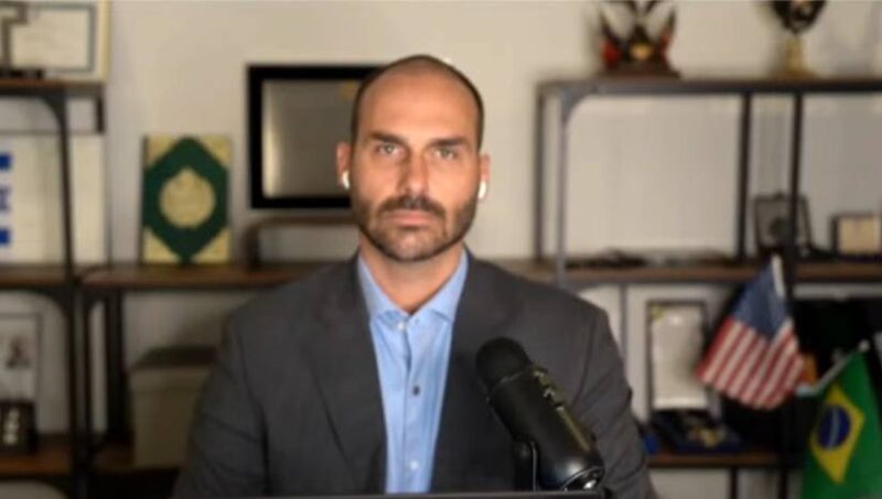 Ao participar de podcast, Eduardo Bolsonaro informou sobre o bloqueio das contas e afirmou que nada será encontrado. “Acabei de ver que bloquearam minhas contas bancárias. Com certeza em nome da democracia”, ironizou.