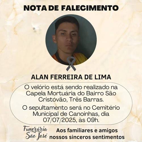 “A Fundação Municipal de Esportes (FME) informa que a Rodada do Campeonato Municipal de Futsal de Três Barras que aconteceria neste domingo, 05, foi cancelada. Em virtude do falecimento do jovem, Alan Ferreira de Lima, de 20 anos, atleta do time Unidos F.C. A FME se solidariza com os familiares e amigos e transmite as suas sentidas condolências.”