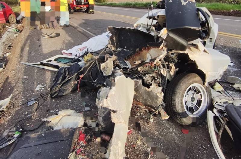 Celestino conduzia o veículo, enquanto Simone ocupava o banco do passageiro. O impacto destruiu a parte frontal do carro esportivo.