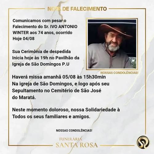 Ivo Antônio Winter foi velado no pavilhão da Igreja de São Domingos e sepultado nesta terça-feira no Cemitério de São José do Maratá, conforme informações da funerária Santa Rosa.
