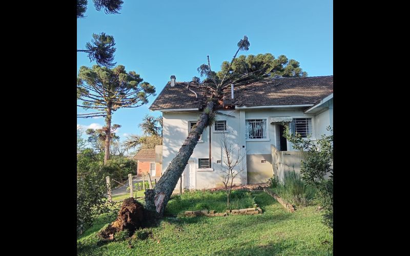 No local, os bombeiros constataram que um pinheiro araucária havia caído sobre parte do telhado de uma residência, devido à intensidade dos ventos, causando a quebra de telhas e caibros.
