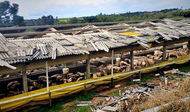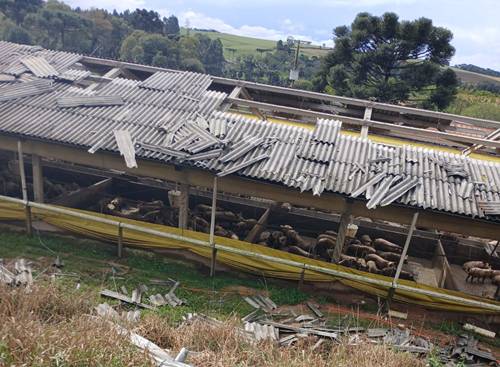 Segundo a atualização divulgada às 18h, foram registradas cinco residências danificadas, um pavilhão de igreja e duas granjas de suínos atingidas.