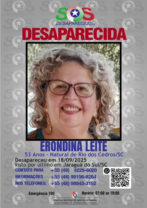 Os cidadãos podem entrar em contato com o SOS Desaparecidos da PM pelos telefones (48) 3229-6020, (48) 99156-8264 ou (48) 98843-3152.