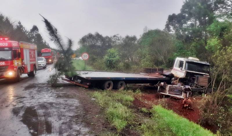 Na tarde desta segunda-feira (06), um caminhoneiro de 60 anos ficou ferido após um acidente na Rodovia PR-151, na localidade da Divisa, em São Mateus do Sul (PR), próximo à Igreja Católica.