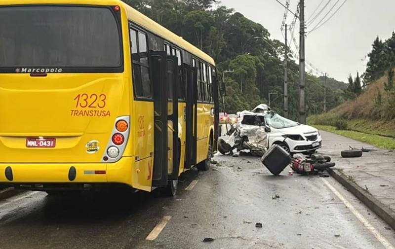 Nesse momento, o Onix foi atingido em cheio na lateral por um ônibus que seguia no sentido oposto. Uma motocicleta que vinha logo atrás também se envolveu na colisão. O impacto foi tão forte que o carro de Jorge ficou completamente destruído.