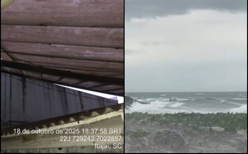 Itajaí: O telhado de uma residência desabou devido às fortes rajadas. Além disso, diversos bairros da cidade enfrentaram interrupção no fornecimento de energia elétrica.