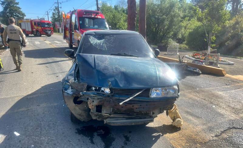 Um acidente de trânsito envolvendo uma motocicleta e dois automóveis mobilizou equipes do Corpo de Bombeiros de Três Barras e Canoinhas na tarde desta segunda-feira (13), na Avenida Abrahão Mussi, por volta das 15h30, próximo a ponte da divisa entre os dois municípios.