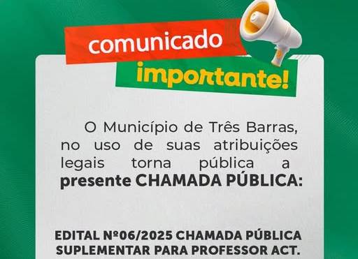 A Prefeitura de Três Barras através do Setor de Recursos Humanos divulgou na tarde desta quarta-feira, 22, o Edital N° 06/2025 de Chamada Pública Suplementar para Professores ACT – Seleção por nível de escolaridade e títulos.