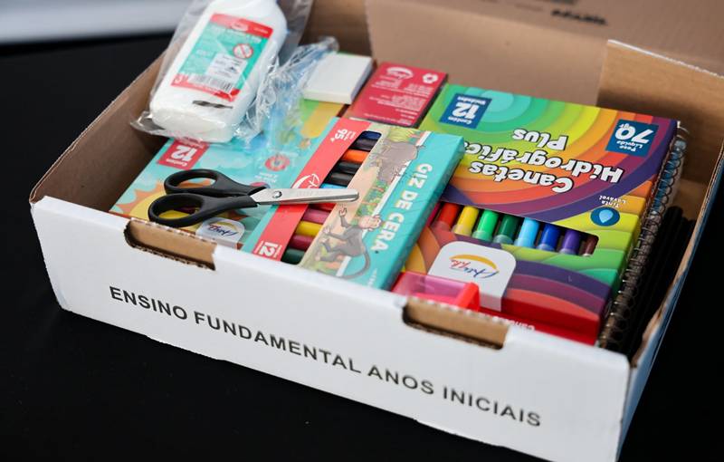 Os materiais serão distribuídos de acordo com as necessidades de cada etapa de ensino. Para estudantes dos anos iniciais do ensino fundamental, serão 20 itens: caderno de brochura, caderno de desenho, lápis de cor, giz de cera, canetinha hidrográfica, borracha, apontador, cola branca, lápis grafite e régua estão entre eles.