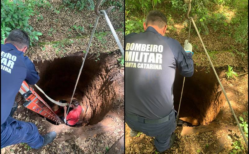 O Corpo de Bombeiros Militar de Irineópolis realizou um resgate inusitado e complexo na manhã desta quinta-feira (7) na localidade de Campo do Meio. A guarnição foi acionada para retirar um bovino que havia caído em um poço próximo a uma residência.
