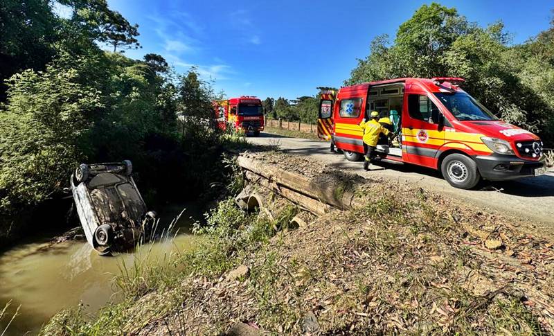 Ao chegar no local, os socorristas encontraram um veículo Fiat Uno Smart branco com as rodas para cima, caído dentro de um córrego.