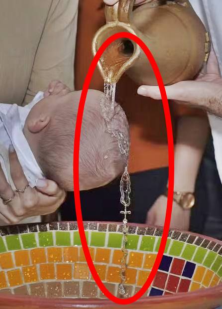 A imagem capturou o momento exato em que a água, derramada sobre a cabeça da criança, formou o desenho de um terço — objeto tradicionalmente usado pelos católicos para guiar orações.
