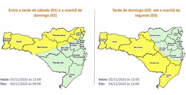 - Sábado (1º) à Manhã de Domingo (2): Os temporais avançam pela divisa com o Paraná e se concentram entre o Grande Oeste e o Norte catarinense.