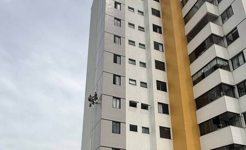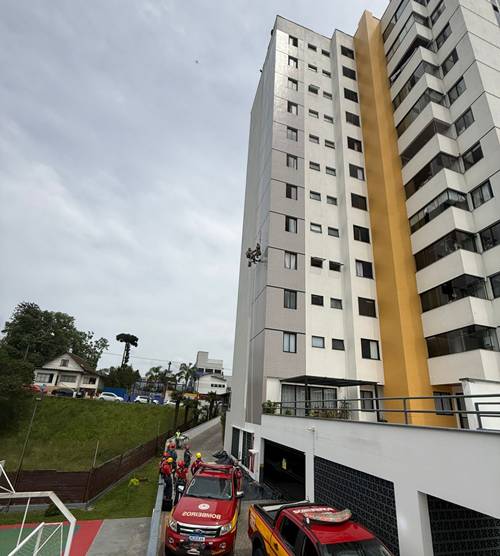 Um pintor de 41 anos foi resgatado pelo Corpo de Bombeiros Militar na manhã desta quarta-feira (5), após ficar preso e suspenso em uma cadeirinha de segurança em um prédio na Rua Augusto Klimmek, no Centro de São Bento do Sul.