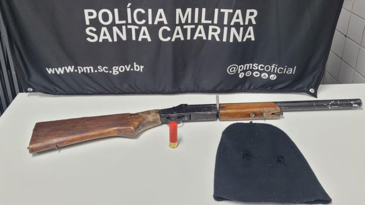 Durante as buscas, o veículo utilizado pelo autor foi localizado em alta velocidade no bairro Bela Vista. No interior do automóvel, os policiais apreenderam uma espingarda calibre 12 municiada e engatilhada (foto acima) além de uma balaclava. Também foi constatada adulteração na placa.