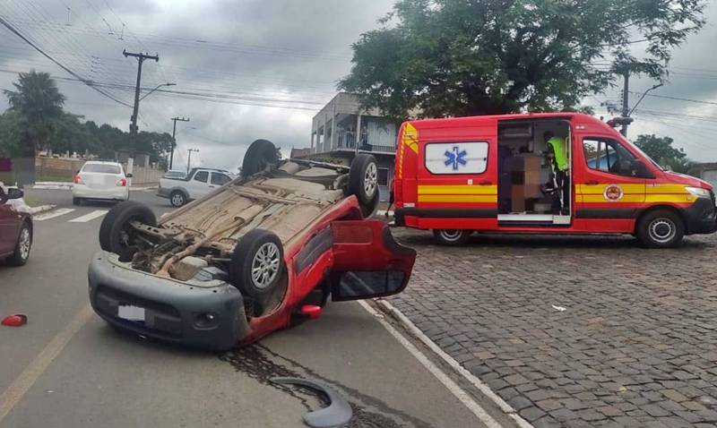 Um acidente de trânsito envolvendo dois veículos, sendo que um deles capotou, mobilizou o Corpo de Bombeiros Militar na manhã deste sábado (13). A colisão ocorreu por volta das 11h50, na Rua Ciríaco Felício de Souza, esquina com a Rua João Batista Pacheco, próximo ao cemitério municipal.