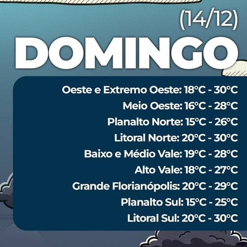 O destaque fica para a segunda-feira (15), quando as instabilidades ganham força em todas as regiões, em especial no Grande Oeste, Planalto Norte e Litoral Norte.