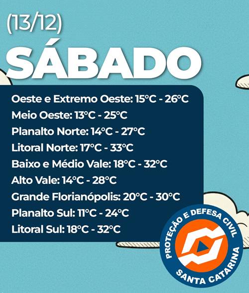 No sábado (13), a instabilidade diminui e o tempo segue abafado, onde as máximas passam dos 30°C em algumas regiões (veja na imagem abaixo). Apesar do tempo mais firme, não se descartam pancadas de chuva e temporais bastante isolados pelo estado.