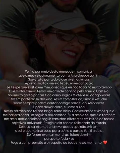 “Venho por meio desta mensagem comunicar que o meu relacionamento com a Ana chegou ao fim. Sou grato por tudo o que vivemos juntos. Aprendi muito com ela, coisas que eu não fazia há muito tempo. Eu e minha família temos um grande carinho pela família Castela. Sou muito grato por ter tido como sogros Michelle e Rodrigo; vocês fazem parte da minha vida. Assim como Dorico, Duda e Vetuche. Vocês sempre podem contar comigo para tudo. Amo vocês.”