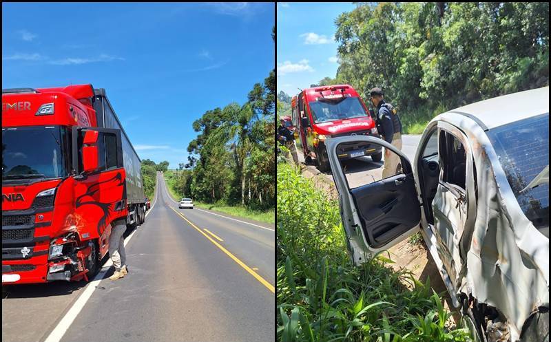 Uma colisão entre um automóvel e um caminhão mobilizou equipes de socorro de Canoinhas e Irineópolis na manhã desta sexta-feira (16). O acidente aconteceu por volta das 09h57, no quilômetro 266 da BR-280. As informações são do Corpo de Bombeiros Militar.