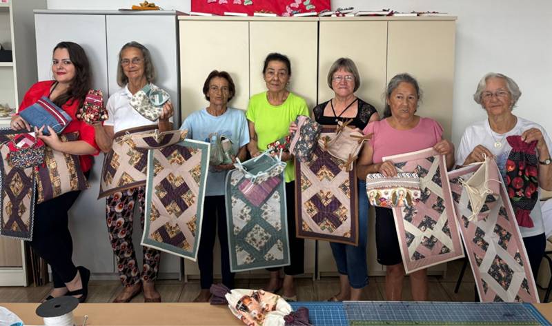 “Este já é o meu segundo curso aqui com o Senar: o primeiro foi de patchwork e, agora, estamos fazendo o de corte e costura. Os trabalhos são muito bonitos. Fizemos cestinhas de pão, nécessaires, puxa-sacos e trilhos, tudo com muitos detalhes. Além de ajudar a espairecer e passar o tempo, o curso pode ajudar a ganhar um dinheirinho e ajudar na renda familiar”, avalia Dirce Catarina Bonete, de 68 anos.