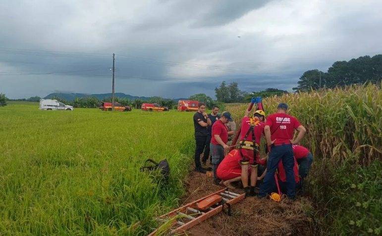 A segunda vítima foi localizada em uma situação ainda mais complexa: o corpo foi encontrado dentro de uma caixa de tomada de irrigação, já no meio da plantação de arroz. Para realizar a remoção, os bombeiros precisaram montar uma estrutura técnica com tripé para içar o corpo de dentro da estrutura metálica.