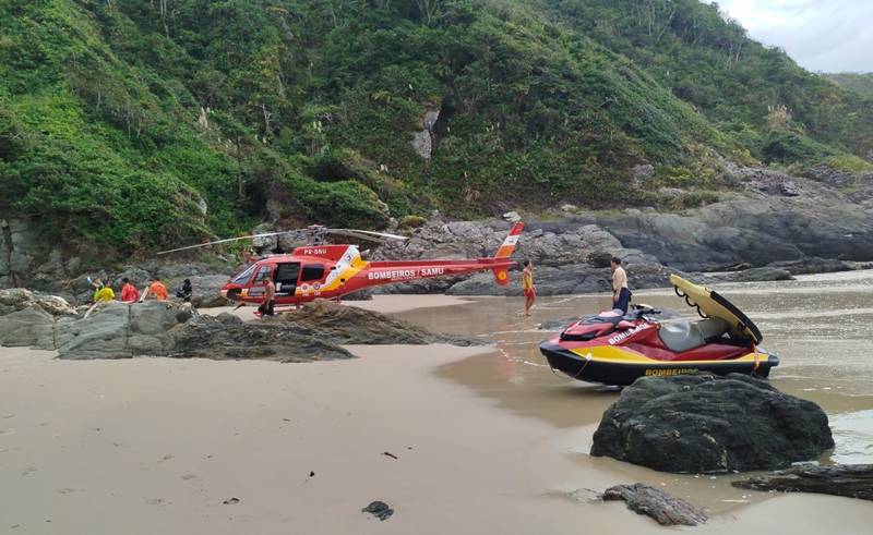 Devido ao difícil acesso à praia, que exige veículos com tração 4×4 e trilhas a pé, os socorristas da viatura ASU (Auto Socorro de Urgência) precisaram integrar a guarnição da AR (Auto Resgate) para levar equipamentos avançados até o local.