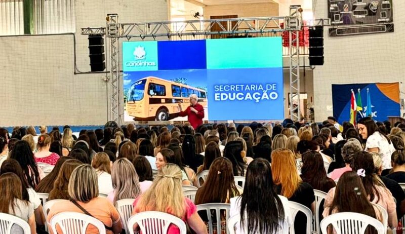 “As crianças a partir do primeiro ano do ensino fundamental terão aulas de inglês”. A afirmação é da vice-prefeita de Canoinhas, Zenilda Lemos. Esta foi uma das novidades anunciadas durante a abertura oficial do ano letivo de 2026 nesta quarta-feira, 4. Cerca de 1.300 profissionais da educação participaram do evento realizado no ginásio Melquíades Pereira da Cruz.