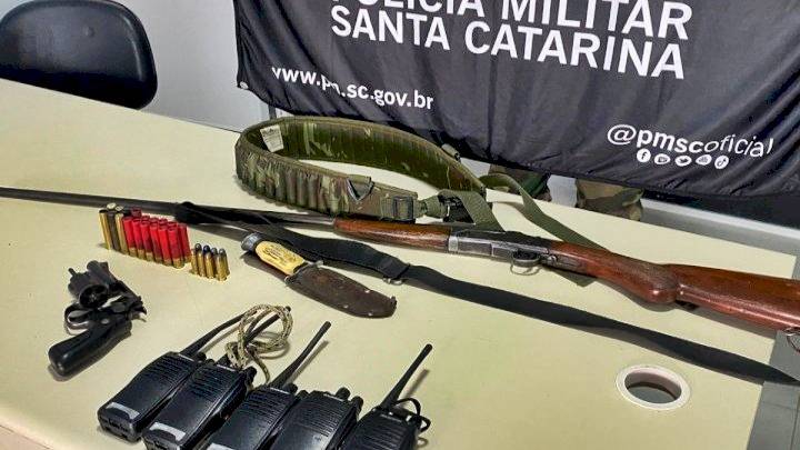 Com o abordado, os policiais encontraram uma espingarda calibre 36, um revólver calibre 38, além de munições para ambas as armas. Também foram apreendidos rádios comunicadores, uma faca e cães utilizados na prática da caça.