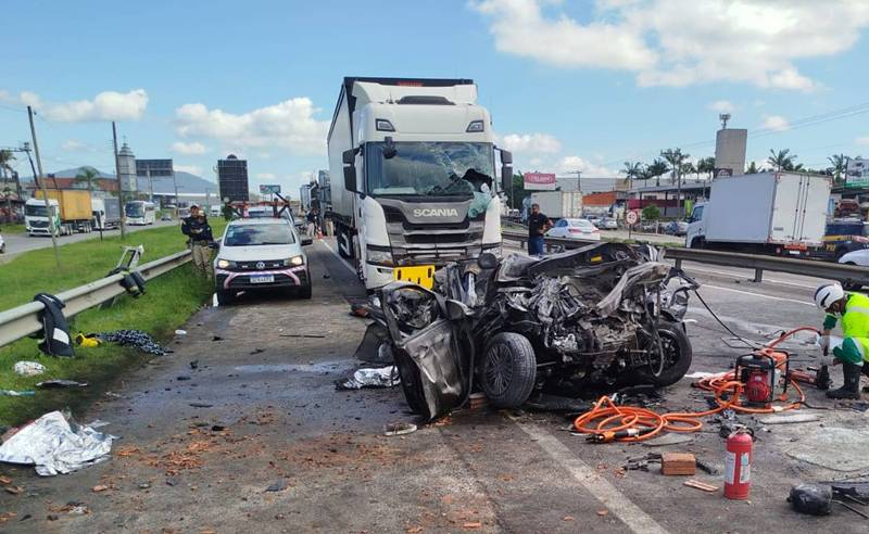 Uma colisão múltipla envolvendo três caminhões e dois carros de passeio resultou na morte de três pessoas e deixou outras três feridas na manhã desta quarta-feira (18), no km 115 da BR-101, em Itajaí.