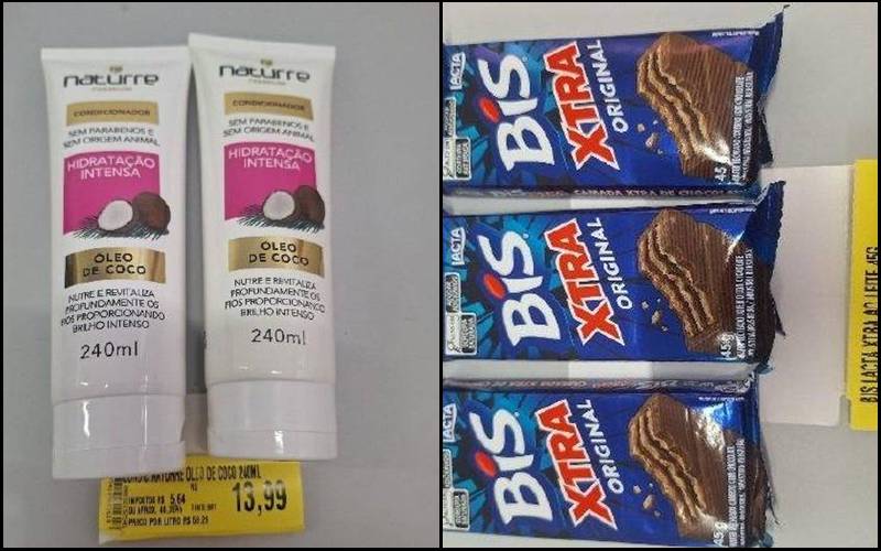 Durante a abordagem realizada pelos seguranças do estabelecimento, foram encontrados na posse da suspeita cinco barras de chocolate e dois frascos de condicionador que não haviam sido registrados.