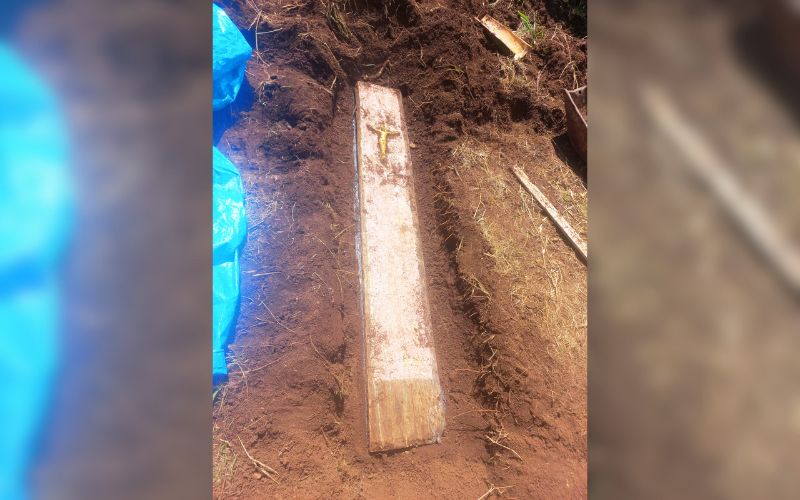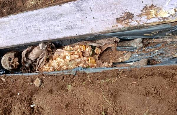 Ao escavar o local, o morador constatou que se tratava de um caixão artesanal. A Polícia Militar foi acionada e, ao abrir a estrutura, confirmou a presença de restos mortais humanos, aparentemente de um adulto, acompanhados de flores artificiais.