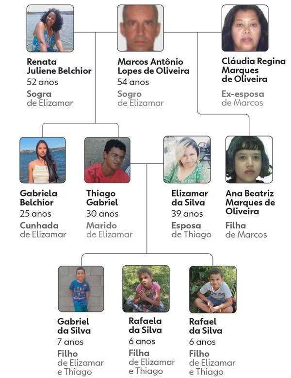 Entre as vítimas estão a cabeleireira Elizamar Silva, de 39 anos; seu marido, Thiago Gabriel Belchior, de 30 anos; e os filhos do casal, Rafael da Silva, de 6 anos; Rafaela da Silva, também de 6 anos; e Gabriel da Silva, de 7 anos.