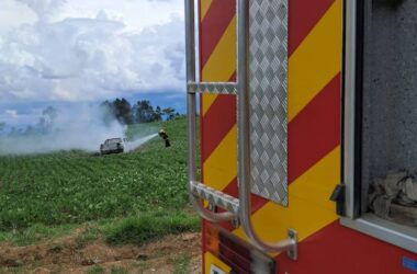 Caso ocorreu na tarde desta segunda-feira (29) na localidade de Rodeiozinho; suspeito agia de forma agressiva e tentou atropelar guarnições que combatiam fogo em caminhonete.